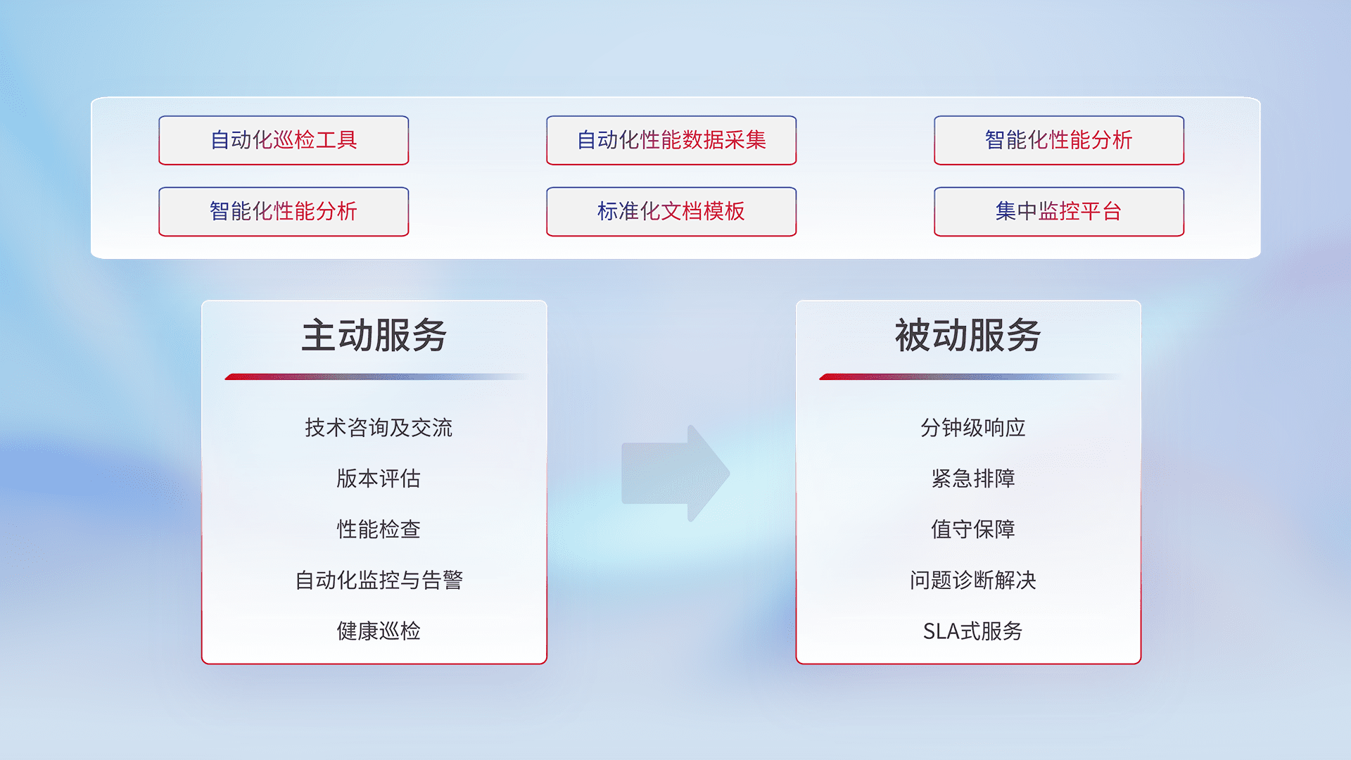 智能化工具和标准化文档,,,,保障服务质量,,,提供主动服务(包含技术咨询、、、版本评估、、、性能检查、、自动化监控与告警、、、健康巡检)和被动服务包含(分钟级响应、、紧急排障、、值守保障、、、、问题诊断解决、、SLA服务)。。。。
